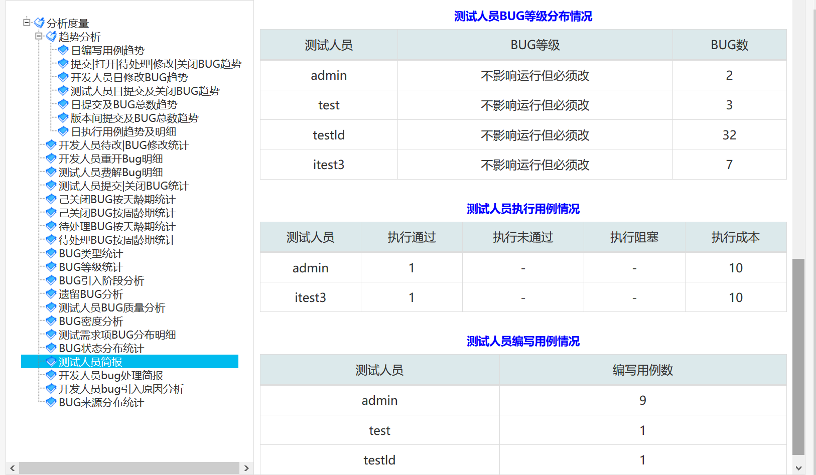 测试人员简报: 里面有测试人员写用例情况,执行用例情况,提交的 BUG数,提交的BUG 按