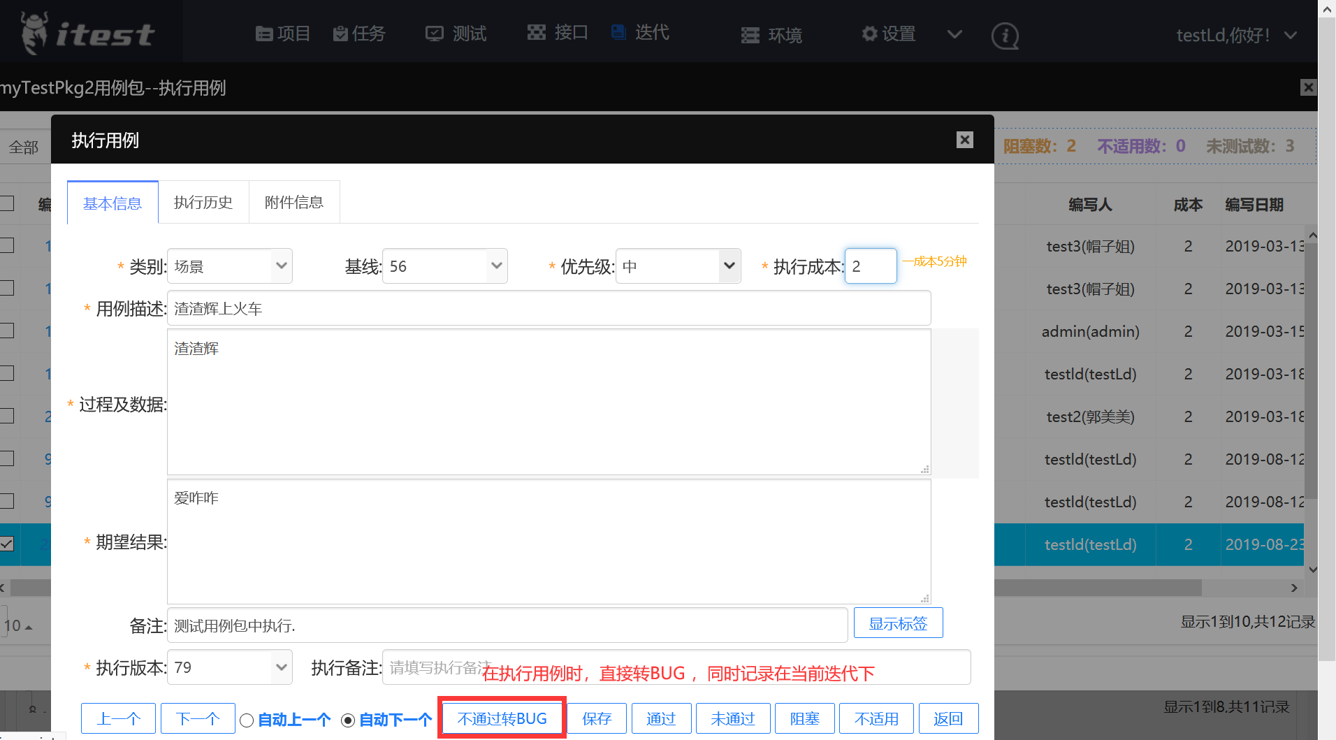 用例执行页面,增加一个转BUG的功能,方便执行时直接转BUG,且自动测试用例为不通过,之前是在用例包用例列表页面点用例ID,