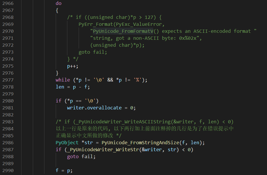 不知道为什么,Python 官方版本不支持中文错误提示(替换的格式串除外)。为此,老吴改动了错误提示相关的一个函数(objects/unicodeobject.c 中的 PyUnicode_FromFormatV),使其支持中文显示,截图如下: