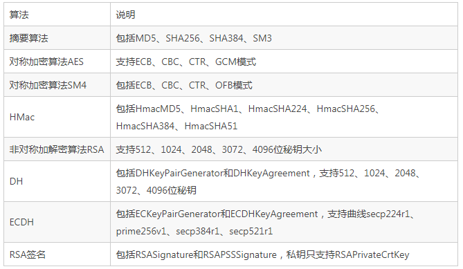 到目前为止,毕昇 JDK 除了默认 Provider 不支持的加密模式外(例如 AES/XTS 模式),已支持 KAE 硬件加速引擎中的所有加解密算法,KAEProvider 具体实现的算法如下: