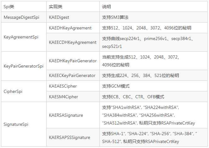 KAEProvider 的实现原理在前期已有介绍,详见openEuler 21.03 特性解读 | 毕昇 JDK8 支持鲲鹏硬件加解密特性详解和使用介绍. 简而言之, KAEProvider 通过实现 JDK 中的特定的 SPI(Service Provider Interface)接口支持具体的算法,此版本实现的 SPI 类如下: