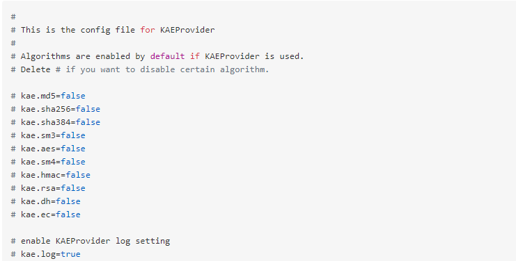 除此之外,毕昇 JDK 为用户提供$JAVA_HOME/lib/ext/kaeprovider.conf 文件,方便用户启动或关闭 KAEProvider 中的某些算法,默认启用所有算法,文件内容如下: