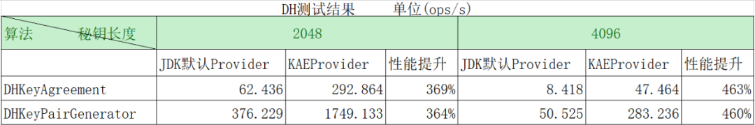 如下为 DH 的测试结果,可以看到与 JDK 默认的 Provider 相比,当秘钥长度为 2048 时,平均性能提升 360%;当秘钥长度为 4096 时,平均性能提升 460%: