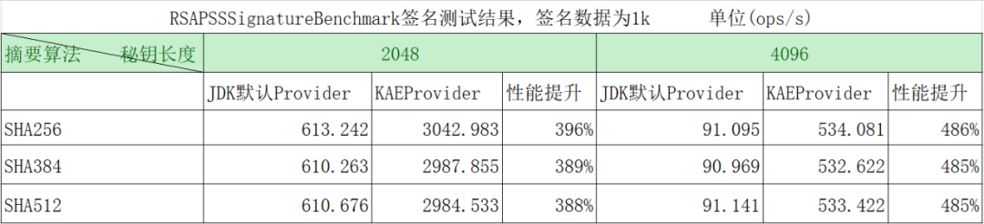 如下为 RSAPSS 签名的测试结果,可以看到与 JDK 默认的 Provider 签名 1k 的数据相比,当秘钥长度为 2048 时,平均性能提升 390%,当秘钥长度为 4096 时,平均性能提升 485%.