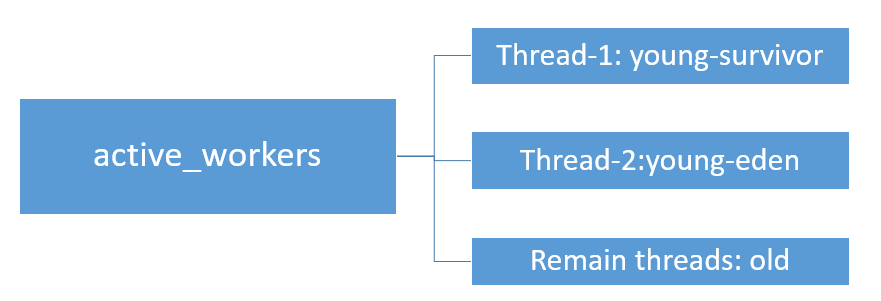 整体扫描策略: 可用的GC线程(active_workers)有两个用来扫描年轻代,一个扫描suvivor区,另一个扫描eden区;剩下的线程全部用来扫描老年代。