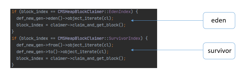 年轻代扫描策略:年轻代的eden(block_index = 0)跟survivor(block_index = 1)区会被分别当做一个整体的block,GC线程扫描时沿用现有的扫描接口object_iterate。