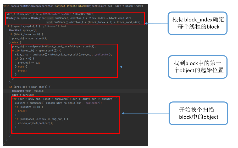 老年代扫描策略:+ 老年代被分成一个个 1M 大小的 block,block 大小由参数 IterateBlockSize 决定。+ 在 ConcurrentMarkSweepGeneration 中新增 object_iterate_block 方法来扫描 block。