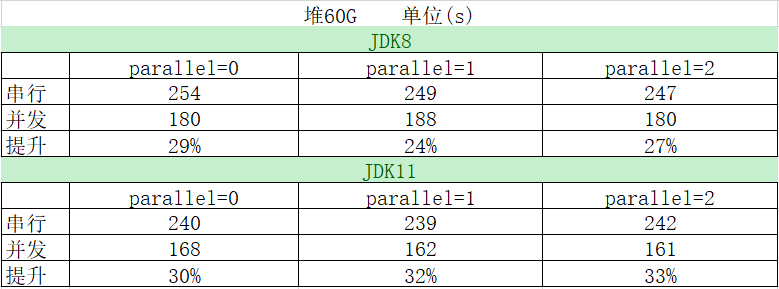 在对约 60G 大小的堆进行扫描时,可以看到 JDK8 并行扫描的平均收益在 26%左右,JDK11 并行扫描的平均收益在 31%左右。