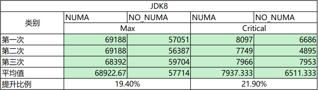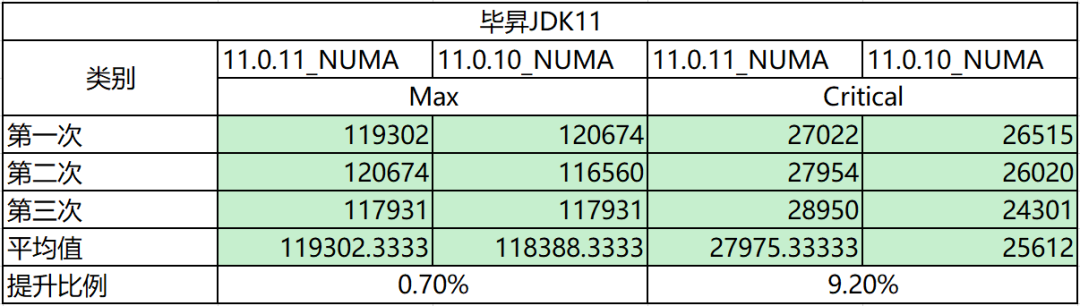 SPECjbb 的测试结果如下,可以看到与毕昇 JDK11.0.10 相比,开启 NUMA 特性后,Critical 性能平均提升 9%,Max 性能无劣化。