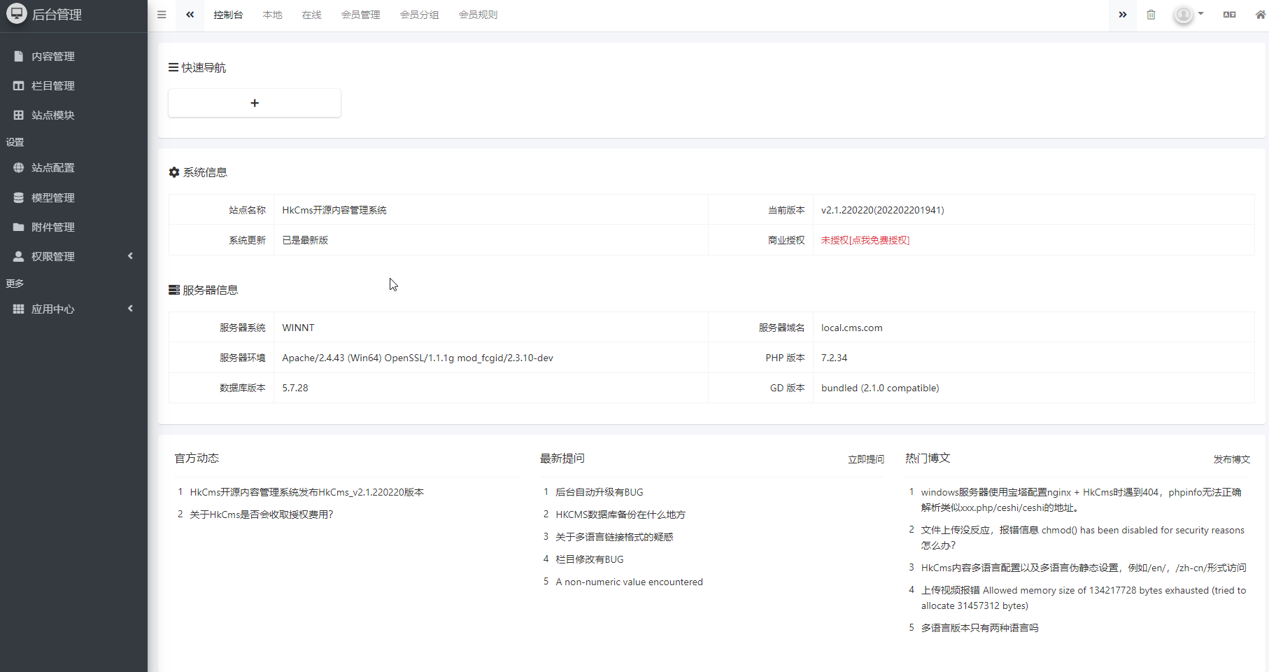HkCms开源内容管理系统是一款基于ThinkPHP6.0开发的CMS系统,可用来快速建设一个PC,手机,微信都可以访问的企业站点。以代码开源、免费商业授权、内容多语言、系统易安装升级、界面功能简洁轻便、易上手、插件与模板在线升级安装、建站联盟扶持计划等优势为一体的CMS系统,我们一直致力于为企业建站提供一款国内真正免费授权的开源内容管理系统,放心使用。