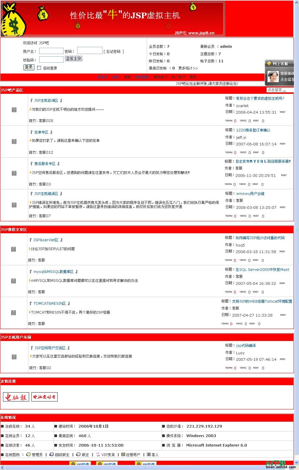 该论坛是我练习JSP写的一个产品,优点访问速度极快,友好百度和GOOGLE等搜索,实现了大部分论坛功能,整个论坛都是JSP实现,只有数据库操作采用了CLASSES文件操作,方便大家学习和探讨。