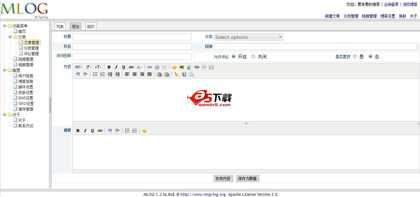 M-LOG是一个遵循Apache License Version 2.0协议的开源软件。 M-LOG是一个用Java搭建的博客程序。该程序使用JDK1.5+、Spring MVC、Hibernate、Freemarker、Lucene搭建。