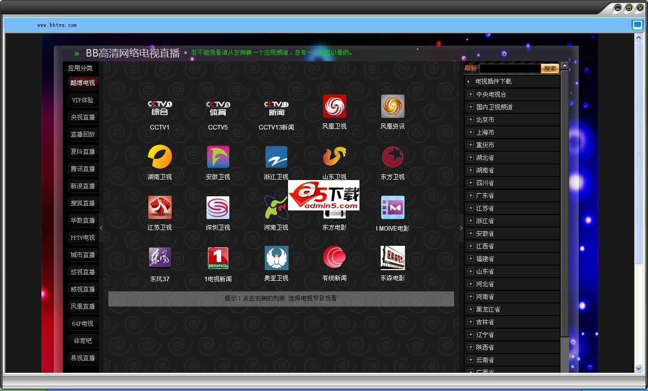 注意:其中有个别电视直播应用频道需要安装其官方的插件方可观看,如不喜欢安装可以选择别的无插件应用频道观看你喜欢的电视直播节目。该软件下载后打开即可观看电视节目。