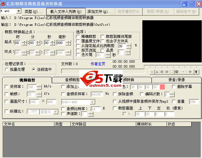 亿彩视频音频批量裁剪转换器对大多数类型的视频、音频媒体,按给定的时间起止点进行批量裁剪、格式转换;裁剪视频画面尺寸;将音频从视频中剥离出来;给视频添加水印;将音频合并入视频中;将系列图片压制成视频;录音、屏幕录像;视频采集等功能。