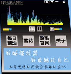 致酷播放器由致酷网开发并发布的一款简洁炫酷的音乐播放器,虽然界面小巧却非常强劲。更有飘雪桌面动画,让你在享受音乐的同时不再单调。
