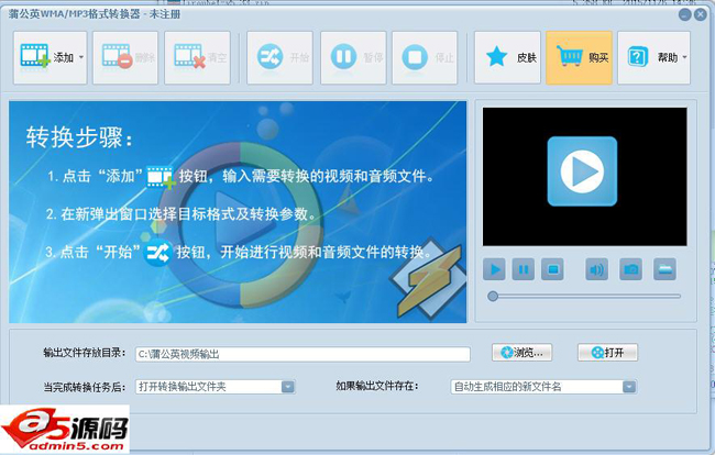 当然软件同样支持将各种流行的音频格式转换为WMA音频格式。软件支持大量文件的批量添加转换,支持无人值守,支持自动关机,支持更换软件皮肤。软件针对多核心CPU进行优化,转换速度提高300%,转换音质完美不失真。对于高级用户,软件还提供了随意定制音频的比特率,采样率等高级功能。可以实现压缩转换音频。软件还可以各种流行的视频格式转换为常用的音频格式,如AVI、MP4、WMV、RMVB、VCD、DVD、SVCD、MPG、FLV、SWF转换为OGG、MP3、WMA、WAV、AAC等各种常见音频格式。以满足用户的特殊转换需求。