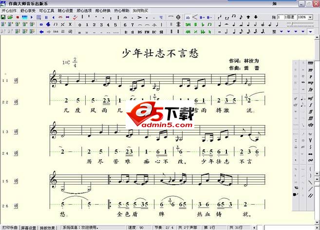 作曲大师是一款专业好用的音乐类软件。软件集简谱、五线谱、简鼓谱、简节奏谱、五线鼓谱 及五种谱混合作曲使用和简线相互转换等功能于一体,尤其方便的是作曲大师的歌词处理功能,可以像文本编辑器一样的复制粘贴和修改,目前更增加了歌词与音符同步调节的功能。尤其方便的是作曲大师的歌词处理功能,可以像文本编辑器一样的复制粘贴和修改,本版本中,更增加了歌词与音符同步调节的功能。如果对这方面有需求的可以下载体验下。