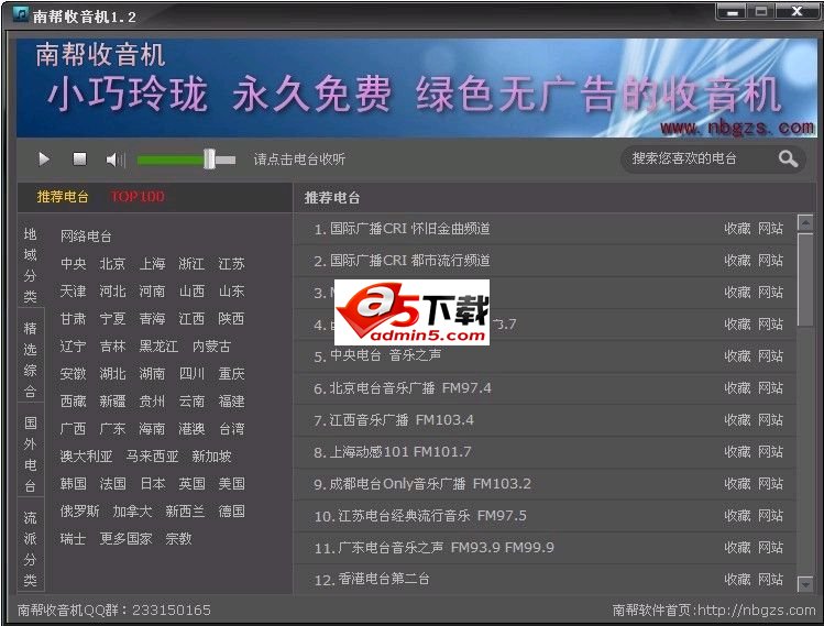 随着网络加速的发展,网速越来越快,网上听电台已不是问题了。使用南帮收音机,只用鼠标稍稍点一下,就能让您听遍全世界的声音。南帮收音机是一款能收听 全球各地网络电台的软件。它具有操作简单、强大的数据管理、在线更新电台数据等特点。