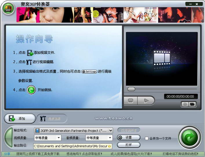 更贴心的是狸窝3GP格式转换器还为您提供视频编辑功能,在3GP转换设置中,您可以对输入的视频文件进行可视化编辑,例如:裁剪视频,截取部分视频转换,把不同视频合并成一个文件输出,调节视频亮度、对比度等。