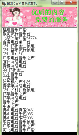 酷235百科音乐收音机,收录频道有福建音乐广播、银河流行音乐台、北方外语广播AM774、香港电台第二台、怀旧金曲频道、都市流行频道、广东电台音乐之声、音乐之声、中国之声等大部份经典电台都有收录免安装。