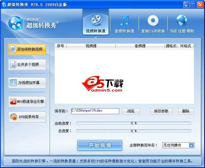 超级转换秀是国内首个集成视频转换、音频转换、CD抓轨、音视频混合转换、音视频切割驳接转换、叠加视频水印、叠加滚动字幕,个性文字,图片等于一体的优秀影音转换工具。