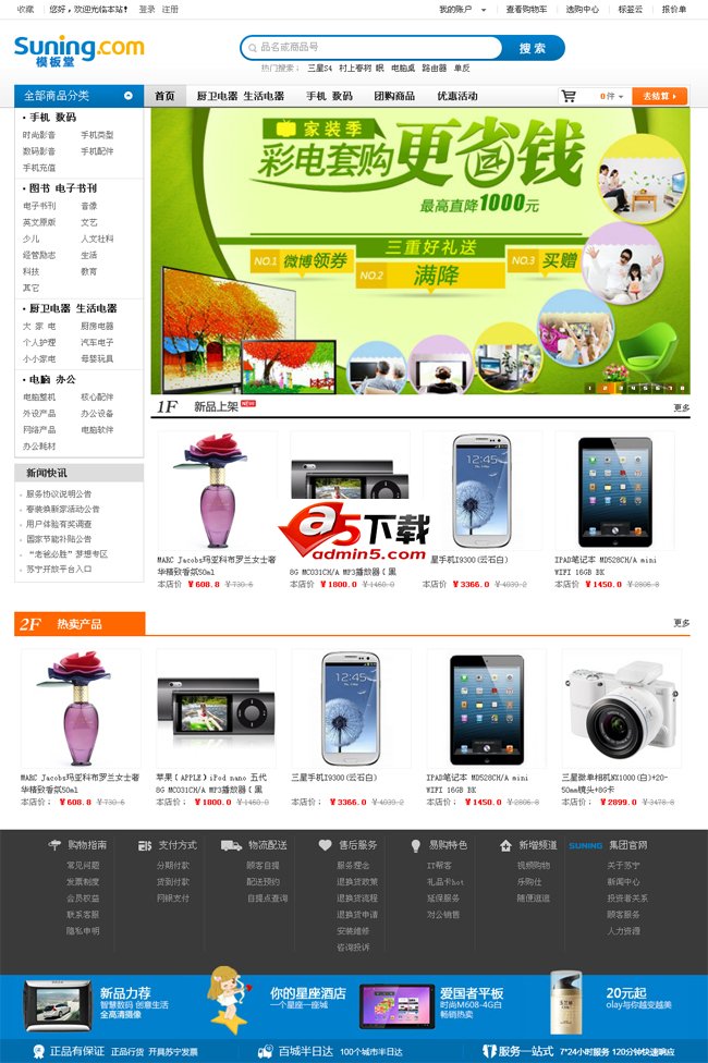 ECSHOP模板堂苏宁易购简洁版模板布局大方,合理实用,配色清爽,菜单功能精细,非常适合百货类的商家使用。