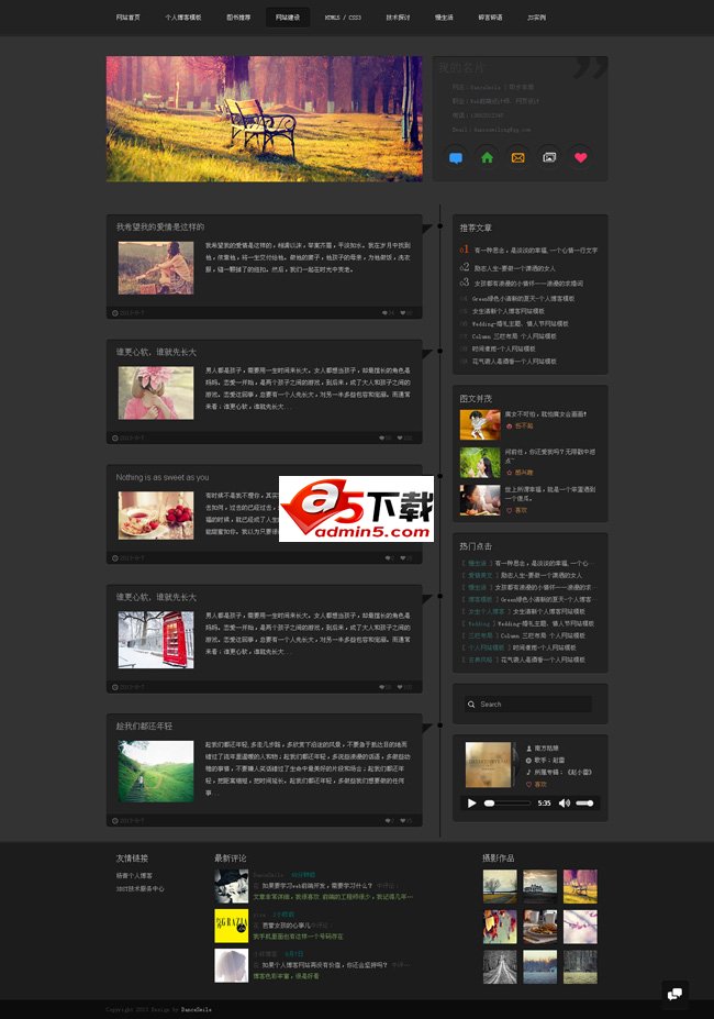 质感时间轴帝国CMS模板以黑色为主色,添加了彩色作为网页的一个亮点,导航高亮显示、banner图片鼠标划过,可以看到隐藏的文字。css3动画应用在banner和右边“我的名片”个人信息。