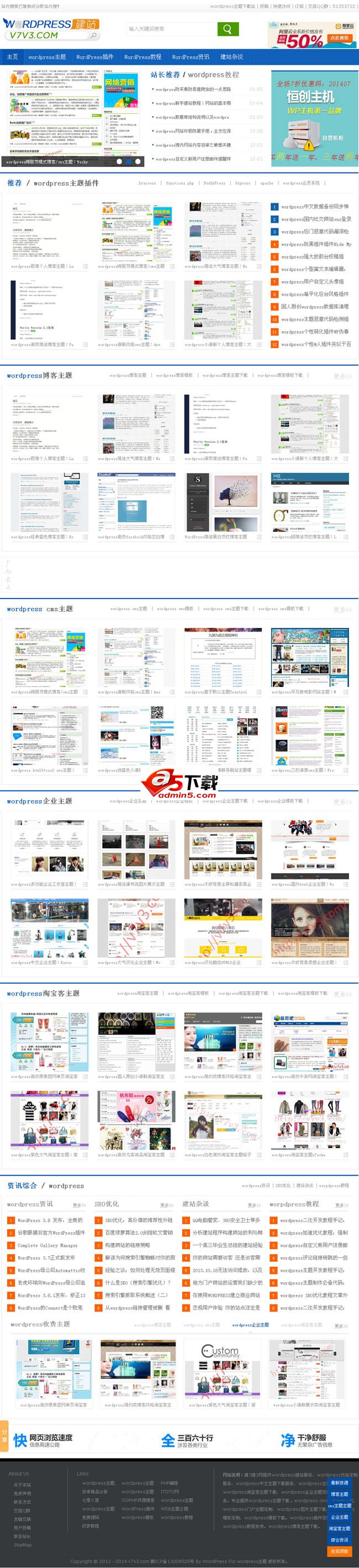 这款wordpress主题来自V7V3网的自用wordpress cms主题,主题整体以蓝色为主,是一款十分强大的wordpress cms主题。在经过作者多次对主题代码的优化后,相对于其他wordpress cms主题来说,在速度上有很大的提升,尽可能的减少了JS和CSS的加载,不管怎样,速度第一!主题的缩略图是采用的特色图片功能,在写文章的时候,可以对每篇文章进行seo设置,可谓是从搜索引擎出发,一款十分利于优化的wordpress cms主题!主题还内置了很多的广告位,而这些均可在后台设置完成。