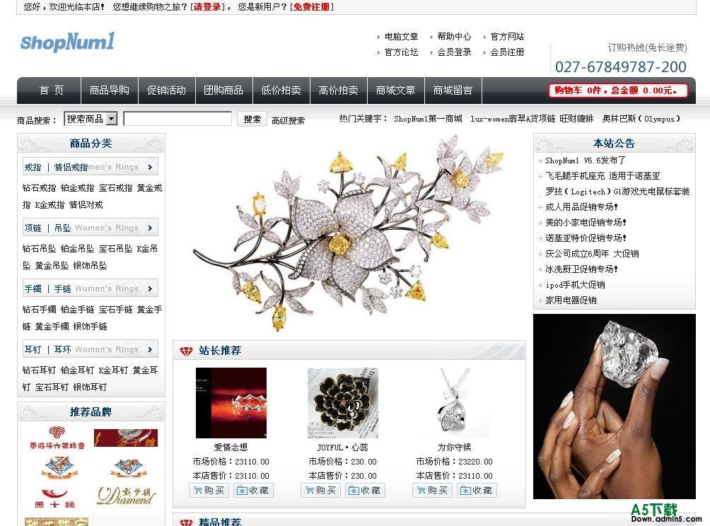 1,模板模块化,可随时在模板的页中加入新的模块,而不是加入很多的Html代码,只是ShopNum1网店系统强大的地方