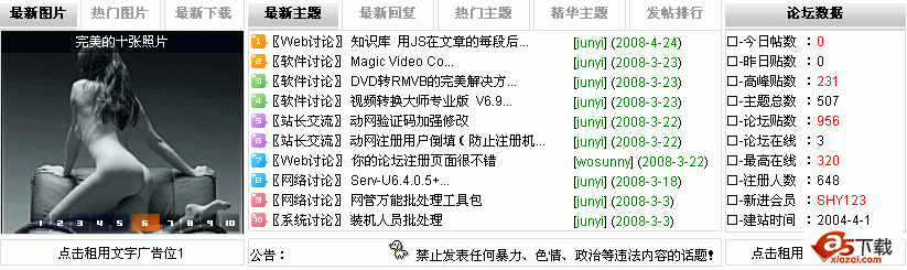 多格多色首页调用 说明: > 多格--多格滑动门。 > 多色--白色/黑色/蓝色 三款可选。 > 绿色--不涉及论坛文件和后台首页调用功能修改,只要在需要显示地方加入调用代码即可。 > 适合7.0以后所有DV论坛 > 调用方式灵活,只要将我的程序文件放入论坛目录,在论坛需要显示的地方放入下面安装说明的代码就行。可以是论坛后台模板修改添加;可以是论坛其它页面文件,比如首页调用文件,直接引用。都是安装说明那段代码。 内附详细安装说明文件!