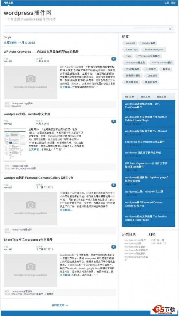 主题特点: 1.右边栏自带标签云(后台可设置) 2.右边栏集成了新浪微博、腾讯微博、搜索微博、订阅等4个按钮(后台可以设置) 3.预留了广告,广告分布在文章页、右边栏,可以在后台设置广告位。 4.支持chorme、火狐、IE7.0+等浏览器,不支持IE6.0浏览器。 5.简介添加自动截断的功能,简介显示为300个字符。