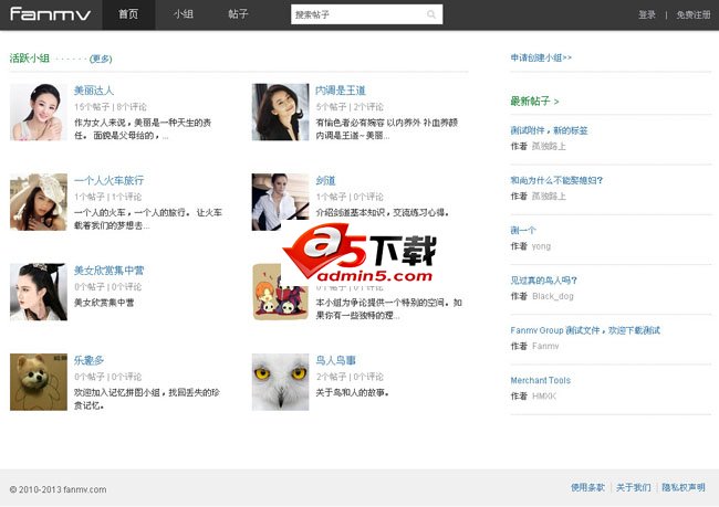 Fanmv Group系统是一套创新的互动社区系统,其以小组为核心,兼有轻博、SNS和BBS特点。既可用来独立建站也可通过帐号与已网站无缝整合,通过小组话题模块、关注讨论交流机制,维护简单,大幅提高用户的参与度,是网站运营不可或缺的系统。Fanmv Group采用微软的ASP.NET 2.0 + SQL2000/2005 技术框架开发而成。独有的技术,让互联网更加简洁高效专注。