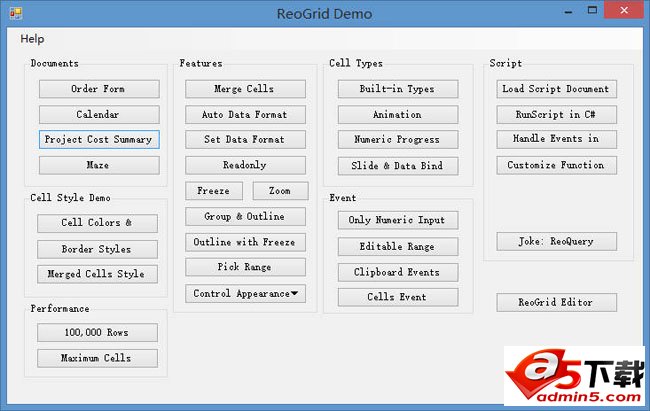 ReoGrid是C#编写的.NET电子表格控件。支持单元格合并,边框样式,图案背景颜色,数据格式,冻结,公式,宏和脚本执行,表格事件等。
