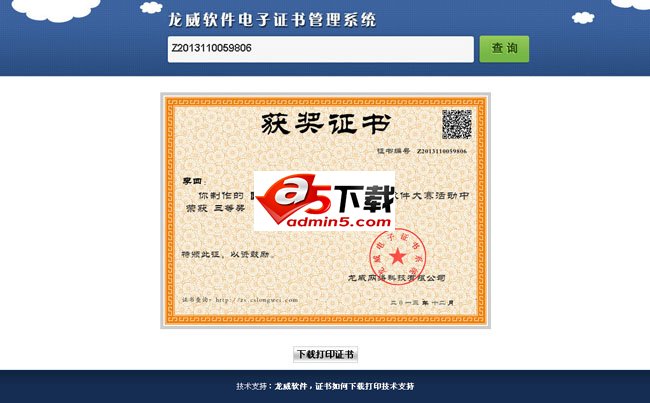 证书在管理后台颁发后, 用户可以通过证书编号,查询到生成的证书,及在线打印证书。