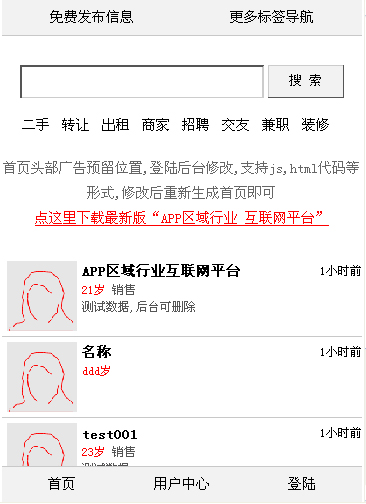 4、站长或平台运营商可以在平台醒目位置设置广告,与商家OTO合作,销售产品服务等多种方式赢利。创造区域行业电商,社交,同城购物,分类信息,线上线下系统等奇迹,挑战原有的站点运营模式。后续可以做其它站的流量入口。可以开发出带数据后台的web app。连接起同城同区域的任何合法的供求买卖等,以及通过人的活动,定向搜索到最新信息,将人与信息关联起来。平台通过一个搜索入口,信息入口,汇聚起人,信息,资源,人脉等,直达所有商品、信息、人与商家。