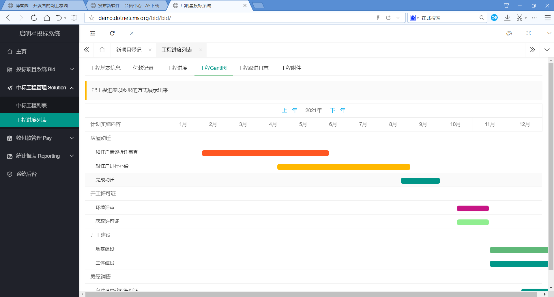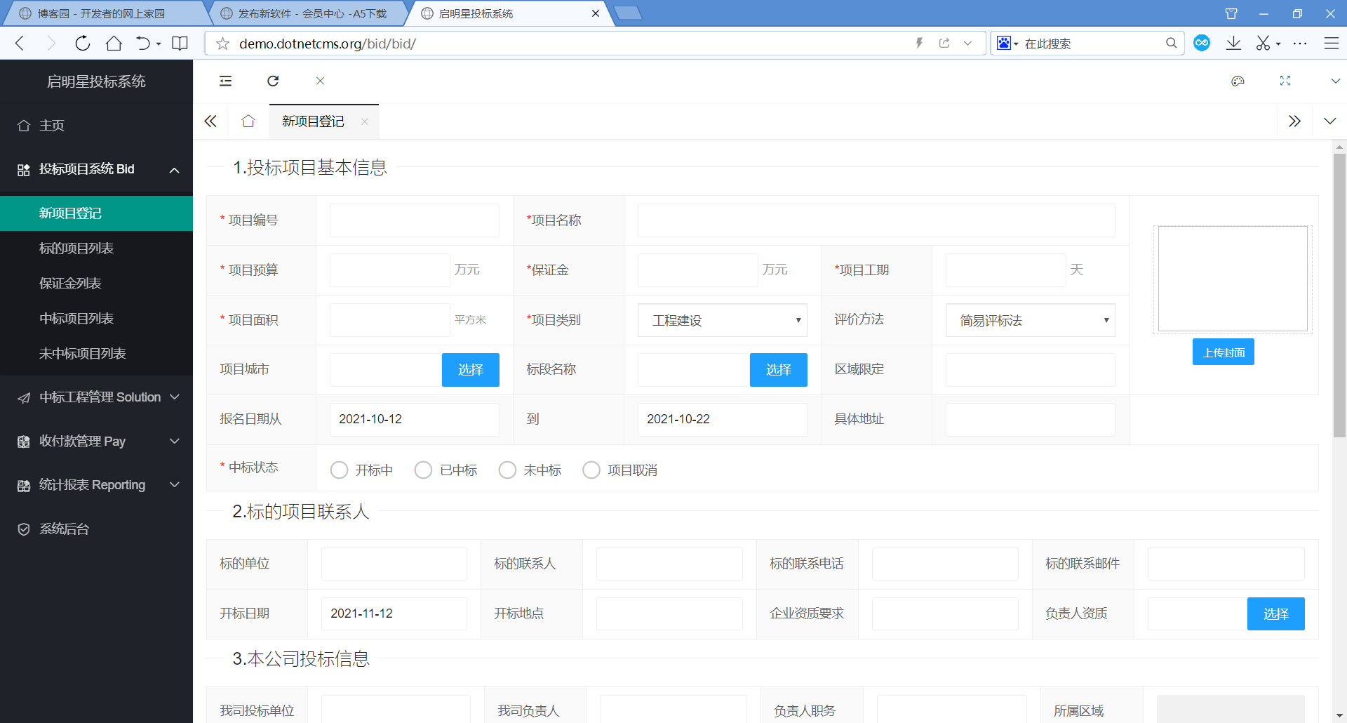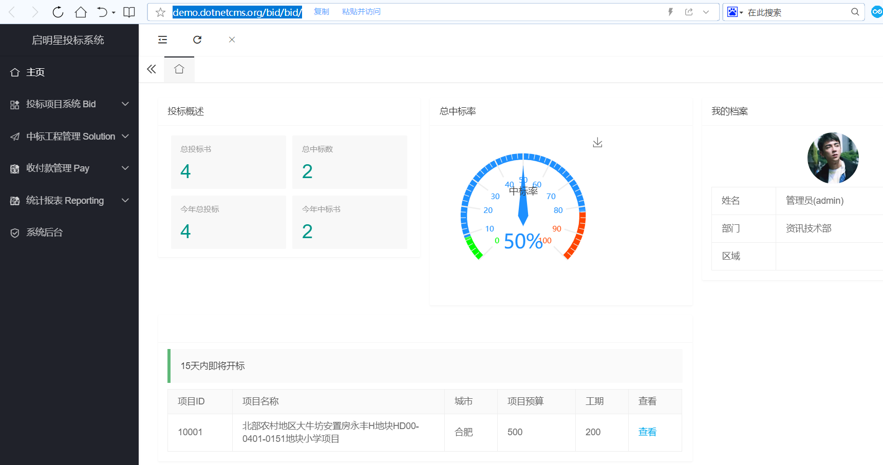 启明星投标系统可以供中小企业管理公司内部的投标。系统包括了中标管理,付款管理和工程进度管理。演示 demo.dotnetcms.org/bid