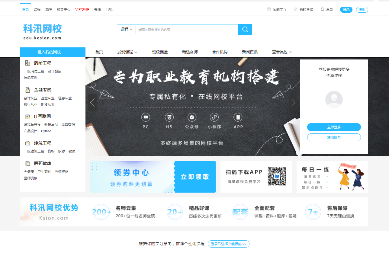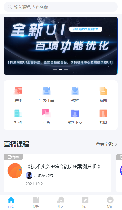 科汛在线网校管理系统V9.0(KesionEDU)是一款适用于教培企业、财经金融、医疗行业、健康养生等几十个行业快速搭建专属的私有化独立部署网校系统,在此之前已经打磨8年多,服务超过2万家的相关培训企业。如今科汛网校系统已经迭代到V9.0版本,该系统是拥有完善成熟的点播、直播互动教学、面授报名、培训计划、专栏、班级、作业本、考试题库、商城(卖教辅周边相关材料等)、求职招聘、CRM、课程分销、代理商、渠道商、机构入驻、名师入驻、丰富的营销工具等功能于一身的在线教育系统解决方案!