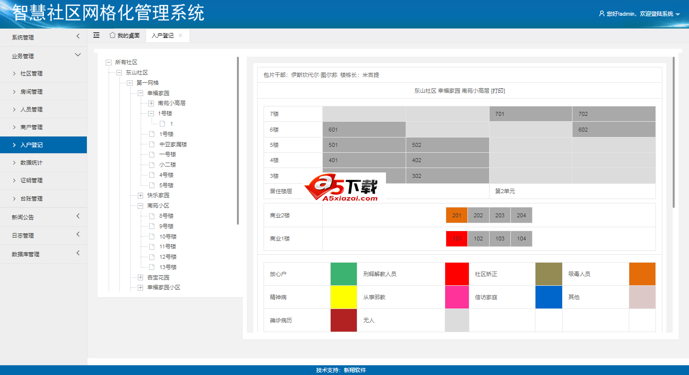 1、软件整体实现了以房管人的工作思路,需要预先在系统中建立社区、网格、小区、楼栋、单元、房间等组织架构、然后在房间里添加人员信息。 2、软件信息量大的网格、小区、楼栋、单元、房间等信息可以Excel批量导入、导出。 3、软件房间信息根据客户需求实际工作需要设计、可实现对住户分类管理。 4、软件自动根据楼栋层数、单元数、单元房间数可生成楼栋平面图方便管理查看住户信息。 5、软件中人员除关键字段外支持自定义设置,以便不同单位的不同需求。 6、软件可实现对社区中商户的统一管理。 7、软件可实现自定义格式证明材料设计及打印。 8、软件提供丰富报表可一键查询导出,同时支持自定义条件查询导出人员信息。 9、软件管理人员实现自定义权限控制。 10、社区党组织管理和党员管理。 11、社区共建单位管理。 13、辖区内单位管理。 14、辖区内工地管理。 15、在线收集表功能,可自定义收集表收集信息。 16、主要信息维护移动端功能。 17、通知公告管理功能、数据库备份功能、操作日志功能 18、本版本支持手机端、可维护社区基础资料、查询人员信息、添加维护人员信息。 19、集成时间令牌动态登录口令功能,增强安全性。