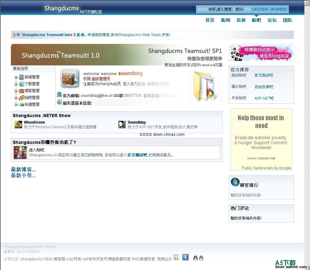 Shangducms NT 是一套基于Web2.0思想设计,采用asp.net 2.0/3.x开发的内容管理系统.它同时也是一套Web2.0全面解决方案,包含:新闻,下载,商城,博客,知道,积分,交友,广告,投票,圈子,群组,饭否等功能,可以根据用户需求任意组合,无缝集成,并修改内核,它采用了业内领先的技术体系架构,隐私保护功能,优异的缓存技术,全文检索技术,灾难恢复技术,XML密码保护技术,可以承载千万级的数据,同时为开源项目,方便开发人员进行产品定制或者二次开发.