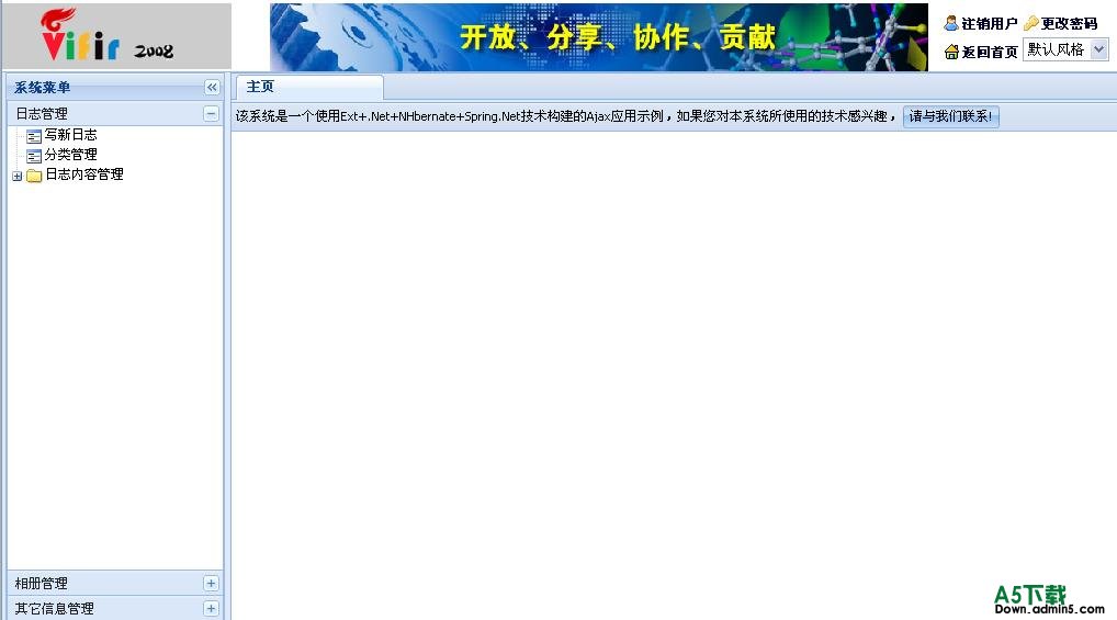 该系统是由vifir.com推出的一个用于演示extjs在.net平台下使用的单用户Blog系统。系统后台使用.Net平台,语言为C#,技术构架为NHibernate+Spring.Net+Vifir实现,支持多种数据库,采用三层结构,数据访问层DAO、业务逻辑层及表示层完全分离。DAO层使用的泛型DAO,只需要一个DAO接口即可,不需要写具体的实现。