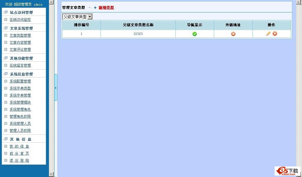ASP.NET 3.5 简单文章管理系统 在线访问监控,文章类型管理,文章内容管理,文章评论管理,其他功能管理,在线留言管理,系统信息管理,系统配置管理,系统字典类型,系统字典管理,系统管理模块,系统管理角色,管理角色权限,系统管理人员,管理人员权限