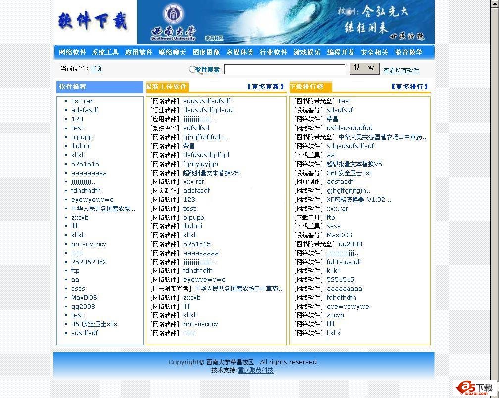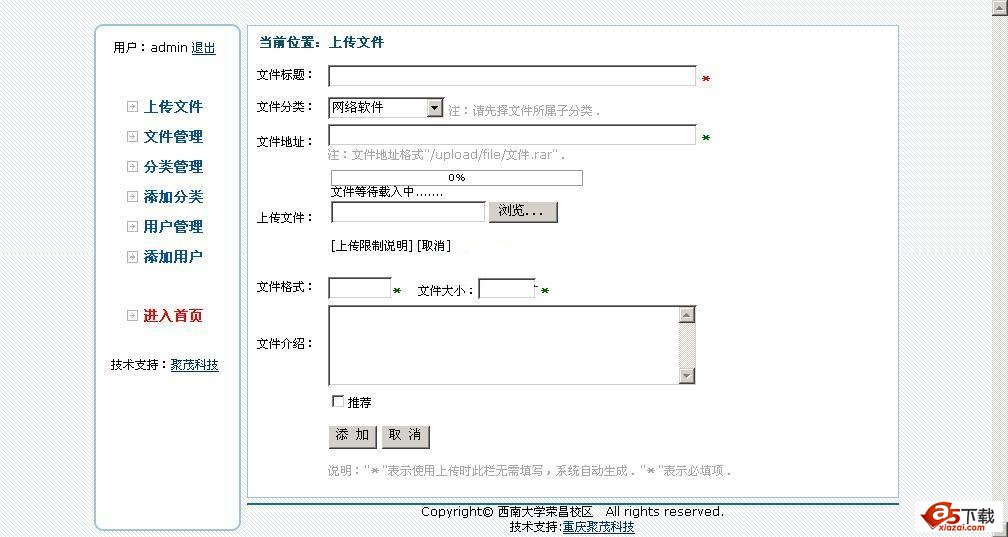 大学内部软件下载系统由asp.net 2.0 开发。是为一所大学内部下载功能而实现的。 数据库在app_data里面。 上传为多文件,大文件上传组件。 后台功能:上传文件,文件管理分,类管理,添加分类,用户管理,添加用户 程序虽然很孬,但都是原创,初手所写,高手饶道