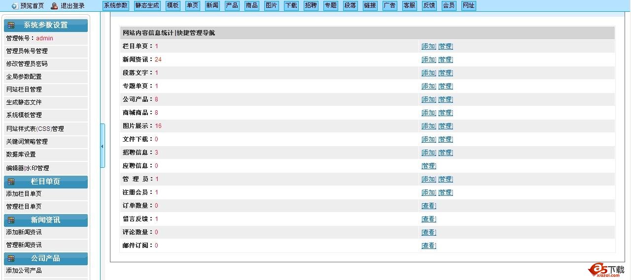 7、拥有各大特色模块:单页、新闻、产品、商品、图片|案例|视频、下载、专题、用户管理、评论管理、邮件订阅、投票调查、人才招聘、友情链接、在线客服、会员管理、图片水印、文字水印、上传格式自定义、上传文件大小自定义等,并包含其他企业网站所具备的常规功能。