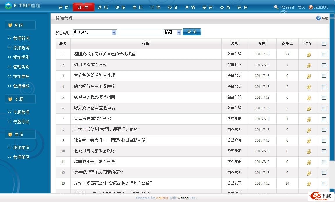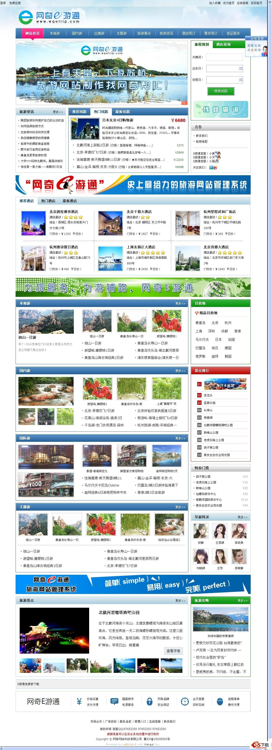 “网奇Etrip”旅游网站管理系统,采用ASP.NET2.0语言开发,它集成新闻模块、专题模块、酒店模块、线路模块、景点模块、订票模板、SEO优化模块、短信营销模块等多项强大功能。