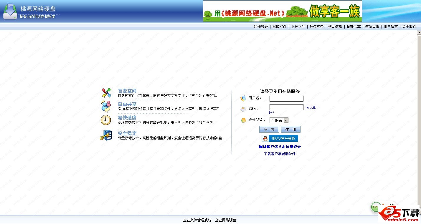 桃源网络硬盘支持文件目录多级共享,树状显示系统功能和目录结构,操作方便,拥有上传码功能、文件提取功能、文件转发功能、好友功能等等,详细功能请看以下介绍。