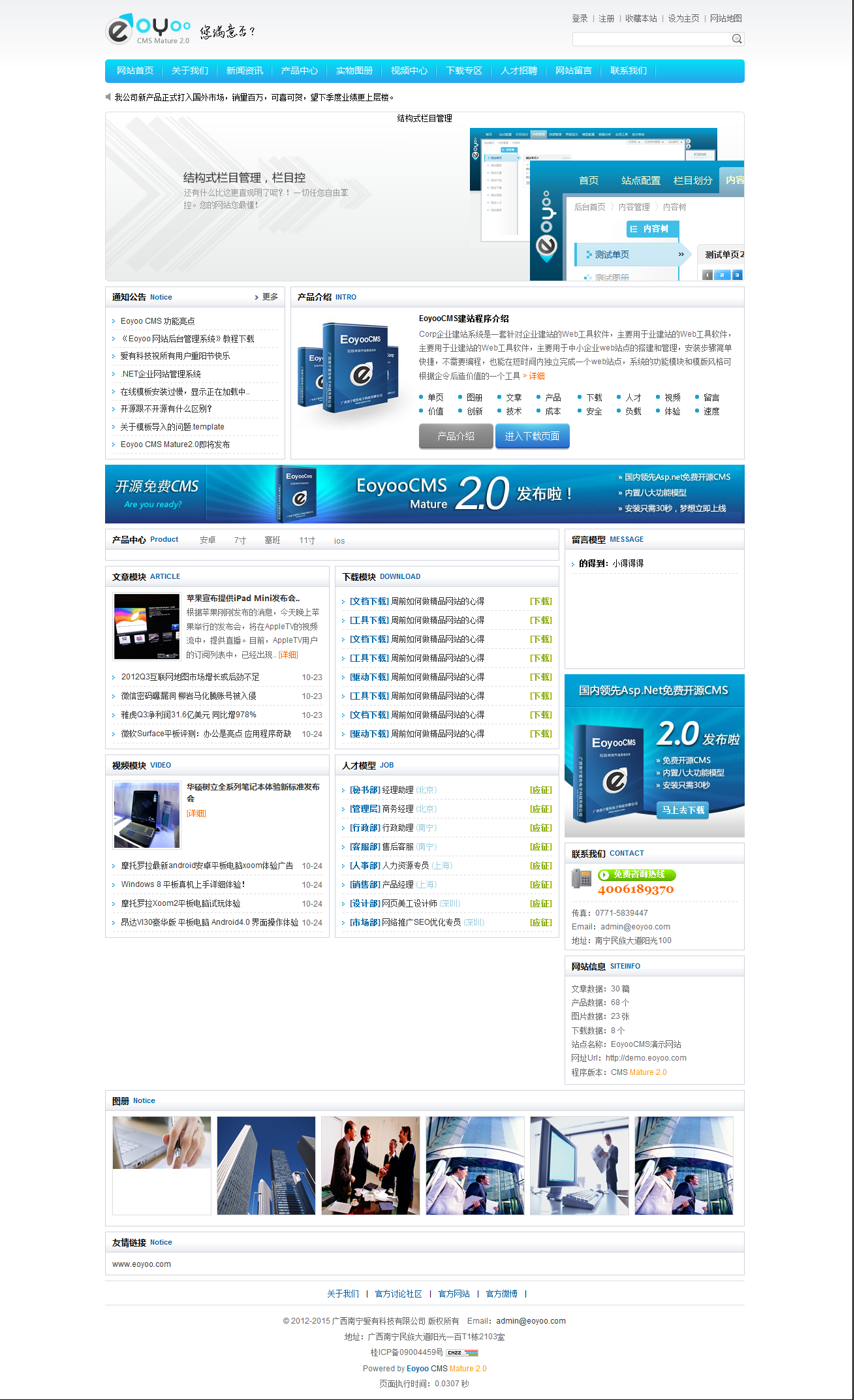 EoyooCMS(英文译名) 是一套基于B/S多层架构的Asp.Net开发的一套网站的内容管理系统,团队于2007年正式投入开发,是最早一批国内领先Asp.Net开发人员,系统由团队完全自主独立研发,从数据库设计到底层代码基建再到前台UI设计,最早的内部版本发布于2010年8月,历时2年的系统完善,目前拥有的成熟模型有:单页、文章、图册、产品、下载、视频、人才、留言。 并且每个模型都可以自定义扩展字段,由用户自定义属性字段。