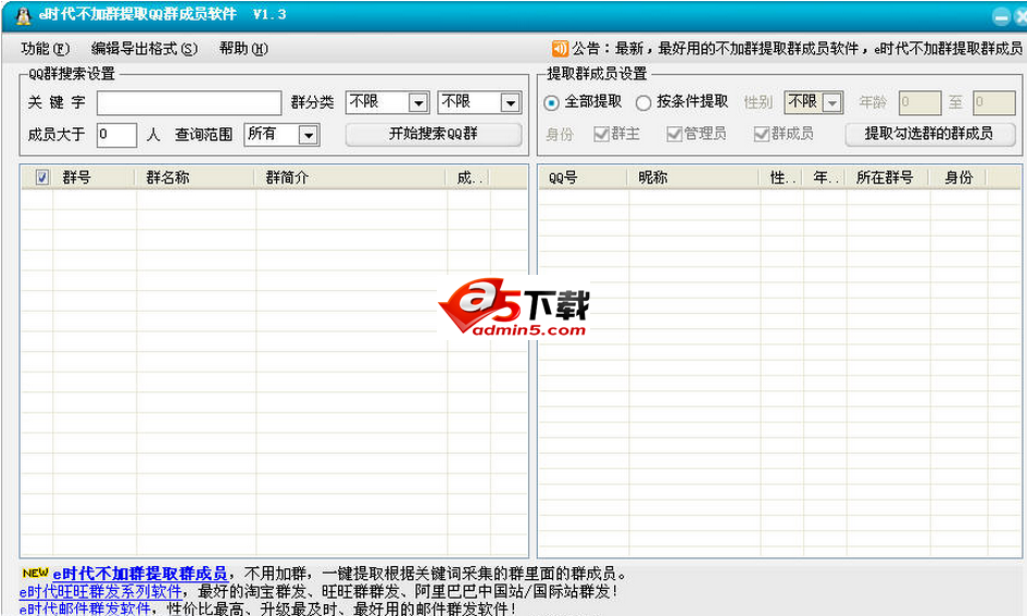 e时代不加群提取QQ群成员软件,是一款无需加入指定的QQ群,就可以实现高速、稳定、全自动的提取QQ群成员,软件支持按照性别、年龄等多种字段自定义查询!软件定期升级维护,并且采用独创的方法定期更新群成员数据,保证大家的使用效果以及用户权益!软件采用网络验证帐号形式,任何机器登录软件帐号以后,可以随时随地的使用软件,欢迎下载试用!
