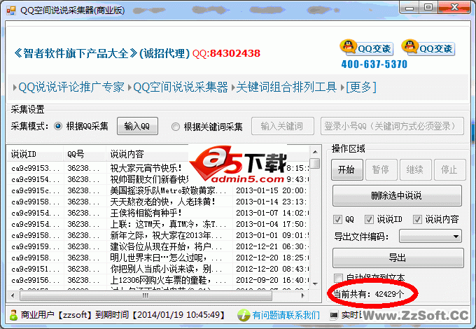 QQ空间说说采集器是智者软件(www.zzsoft.cc)推出的一款针对指定关键词或者指定QQ号进行批量搜索采集QQ空间说说的工具,可把QQ说说内容(自动过滤#和HTML代码)说说的ID,说说的发表QQ等信息采集下来。支持自定义格式导出为文本!可用于原创文章组合、说说评论营销、QQ号营销等。