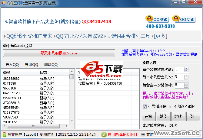 QQ空间批量留言专家V2是智者软件(www.zzsoft.cc)推出的一款针对QQ空间进行批量留言以达到广告宣传群发、QQ空间刷留言的目的!具有精准定位客户群进行营销的特性!支持QQ记录状态(第一次登录后会把登录状态保存下来,下次直接留言不再登录,避免QQ频繁登录被封)!同时支持第三方验证码全自动识别验证码登录QQ!支持多条信息随机抽取评论,支持外部导入QQ号直接批量留言!推荐与智者软件出品的:智者QQ采集器、QQ空间日志采集器、QQ日志评论推广专家配合使用!