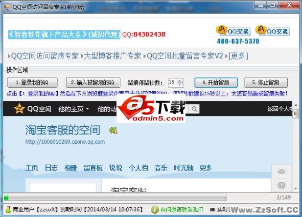 《QQ空间访问留痕专家》是智者软件(www.zzsoft.cc)出品QQ类营销的新一代利器,主要功能是不断的去访问别人的QQ空间,留下痕迹(最新访客),以达到让对方回访的目的,可利用QQ空间进行广告、产品的宣传!支持长期挂机使用! 可于《智者QQ采集器》配合使用,效果更佳!